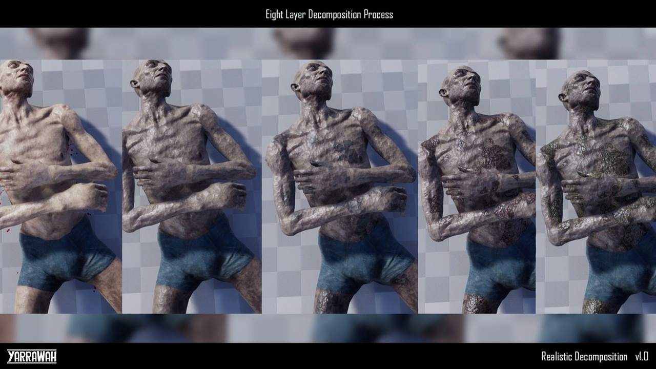Please note: Characters are for demonstration only and are not included in this pack.Looking for a more realistic way to dispose of your characters? Add Realistic Decomposition to your game! This asset can be added to your project in less than two minutes and is entirely non-destructive!Watch your characters decay and rot over time, as flies make their home and maggots begin to spawn from the peeling flesh. The fabric will stain as the body decomposes underneath, moistening and seeping through t