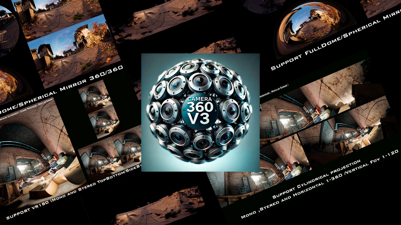 Camera360v3 - camera system for 2D, VR180 , 360, Fulldome, Cilindrical and Spherical Mirror - Mono and 3D Stereo version)This product contains a set of popular projections for visualization of various directions, working in Editor, which can be useful in everyday work.This product is designed as an optimized solution that uses rendering with a single camera, which means that it will be enough for you to work even on a weak machine.Help Widget Camera360v3: Trailer: YoutubeDocumentation: LinkForum