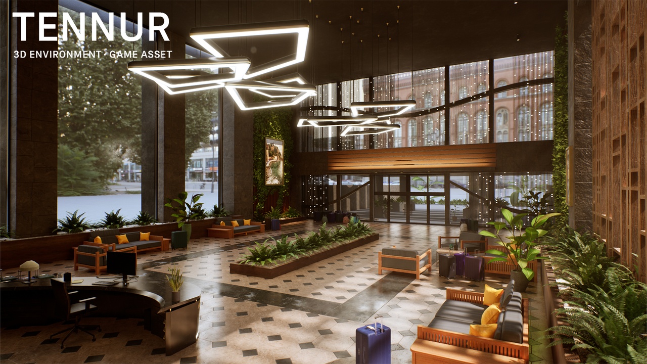 Hotel Lobby Environment with 138 Unique Meshes. Including all showcased assets, and high-quality assets. With a good level of detail and optimized for Game Ready Projects.Showcase VideoIncludes Showcased Preassembled SceneIf you want to populate your game environments or any kind of Virtual Production levels here is the pack that you get and use to get high-quality visuals and well-optimized assets.Lumen enabled. Includes nanite meshes.For all your promotional requests, technical support needs,